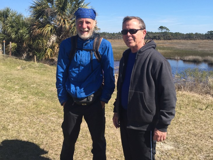 You just never know who you might run into, even when you are walking deep in the woods. Last Saturday, we decided to go on a fairly long trek in the St. Marks Wildlife Refuge. It was a clear brisk morning and a great day to be outside. About half way into our hike, Morgan, Ellie, Pam, Jerry and I stopped at the end of a trailhead on a dike to refresh ourselves with water, fruit and snacks. Just as we stopped, I looked up and a guy walked up with carrying a small backpack. Thinking he was walking one of the local trails, I asked him where he was hiking. He replied, “I just walked from Key West”. Yikes!