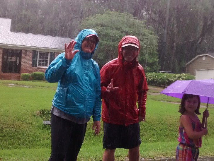 The people in our neighborhood must think we must have lost our minds. After discovering the joy of walking in the rain, once it starts, we put on the foul weather gear and head out the door. Recently we took this newly acquired routine to a whole new level. Last Saturday, after the threat of severe weather passed, our oldest grandson Tyler asked if we could go for a walk in the rain. I looked at Morgan and thought, why not, there was no lightning but just heavy rain.